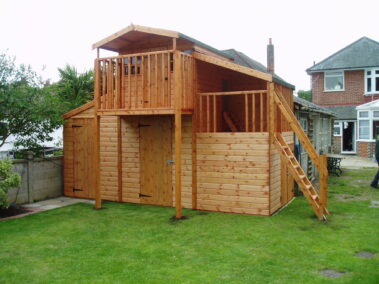 The Little Ben playhouse is a design named after Seans first son Ben. With shorter eaves gives the possibility to put these buildings on stilts as pictured (not included in the price). With a stable door with windows on either side, and on each return side panel. All windows are perspex with Georgian bar for added security.