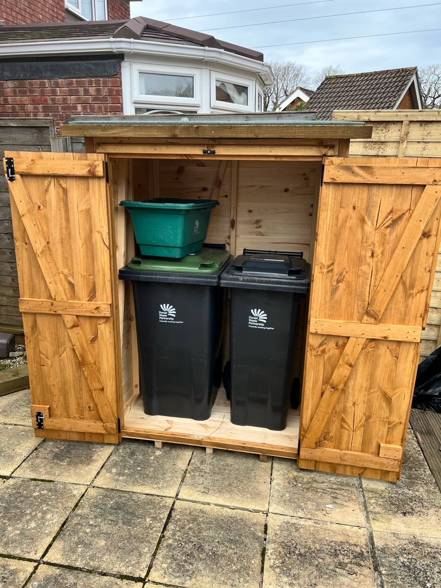 The Bin & Recycling Store is a great place to keep you household bins neatly and secure. This combination shed has a main compartment for two large bins. Bin stores over 4′ receive a side recycling and small bin shelf compartment. All Stores are built to the standard shed specification.