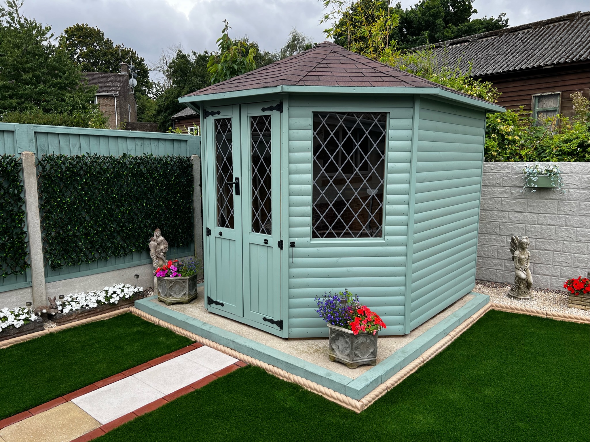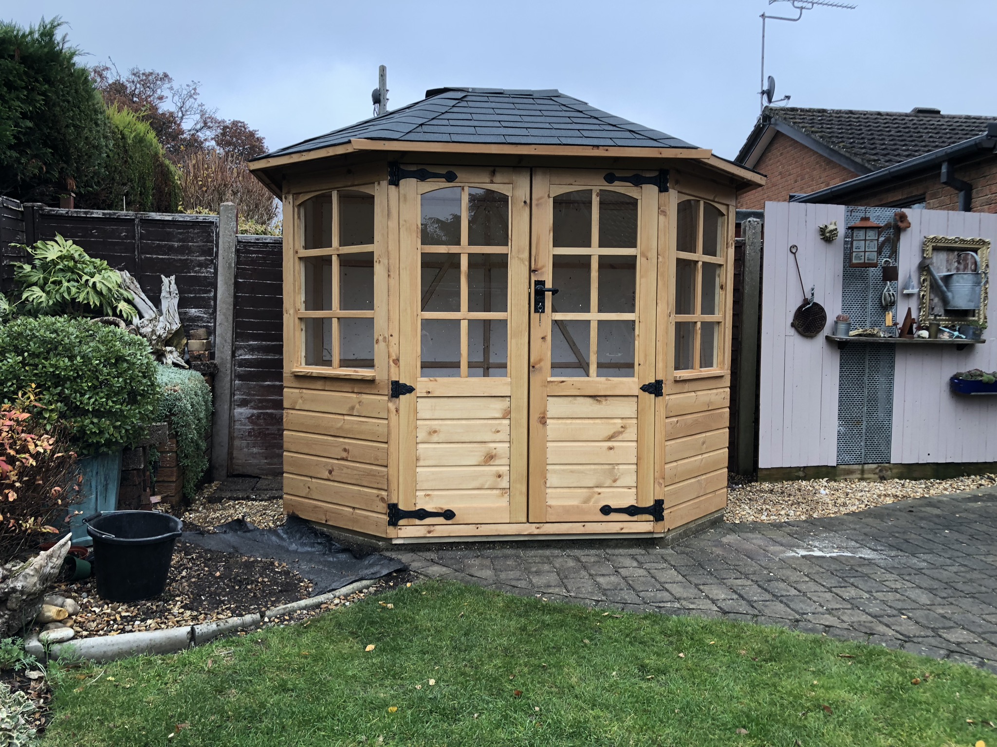 Our New Forest Summerhouse is our newest model on the S&N Timber Summerhouse line. Much like the Octagonal Summerhouse with a roof panel above the doors and angled window return panels. This summerhouse however features a square back giving more internal floor space than the Octagonal. This six-sided roof summerhouse truly is one of a kind. Manufactured in our workshop in Bournemouth, it’s the only hand built, six-sided roof summerhouse made in the area! Featuring a set of double doors with windows on each return side panel. The windows can be all added to one side or completely removed all together.